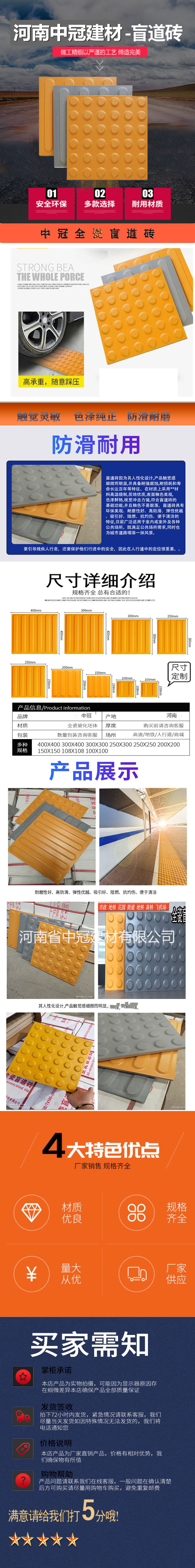 我們的盲道磚是全瓷的,不是塑膠的,也不是水泥,而且尺寸是經(jīng)過修邊的,不要害怕有誤差,厚度也達(dá)標(biāo)的,顏色是不會掉色脫色的,還有什么不放心的電話咨詢吧!18239167111\18839118777